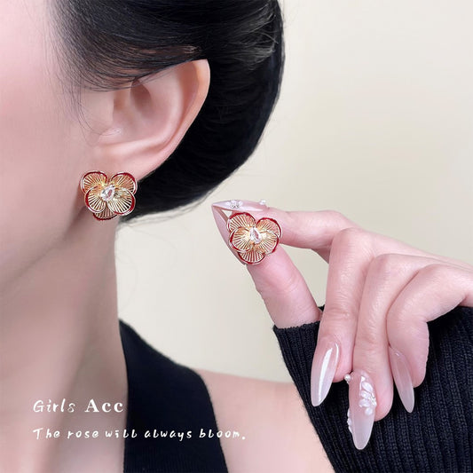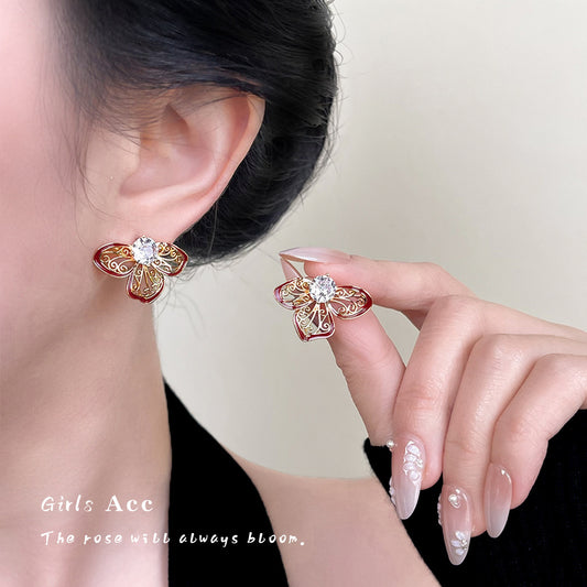A廠 銅鍍金|日韓款 鏤空蕾絲花瓣滴釉銀針耳環 批發 折扣@洽客服 26.02.W1「7071」
