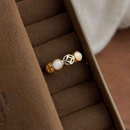 A廠 銅鍍18K金 |日韓款鏤空錢幣玻璃貓眼石戒指「7241」