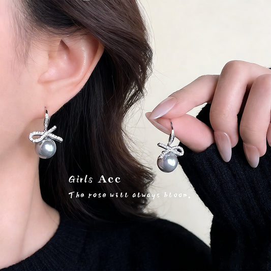 A廠 銅鍍白K|日韓款輕奢鋯石蝴蝶結灰珍珠銀針耳環 批發 折扣@洽客服 26.02.W3「3969」