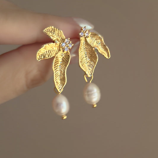 A2廠 韓國韓版鋯石珍珠樹葉鍍14K金銀針耳環 批發 折扣@洽客服 25.03.W2「HE24757」
