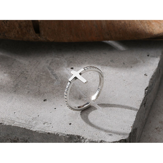 韩国韩版新款S925纯银简约复古泰银麻花十字架开口戒指指环银饰品