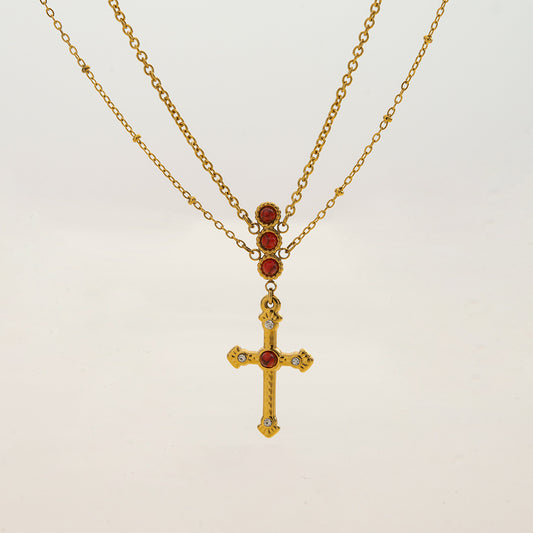 B廠 歐美款 SOPHIA 紅松石十字架吊墜鈦鋼鍍18K金項鍊 批發 折扣@洽客服 25.08.W1「JDN0204054 」