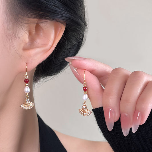 A廠 日韓款手作淡水珍珠紅瑪瑙扇形耳環 批發 折扣@洽客服 26.01.W1「7025」