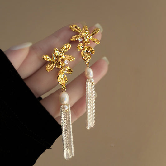 A2廠 韓國韓版鑲鑽花朵流蘇珍珠銀針耳環「HE24418」25.01.W4 批發折扣@洽客服