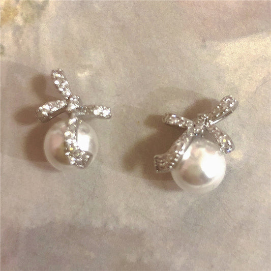 A2廠 韓國韓版鋯石珍珠蝴蝶結銀針耳環 批發 折扣@洽客服 25.11.W1「HE28946」
