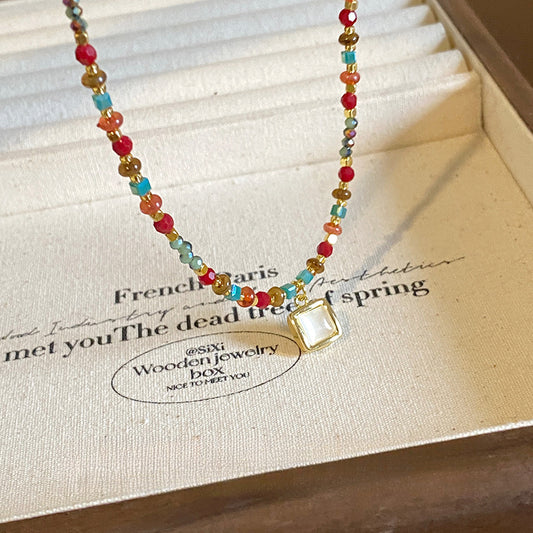 A2廠 韓國韓版貓眼石水晶串珠方形吊墜項鍊 批發 折扣@洽客服 25.08.W1「HN9332」