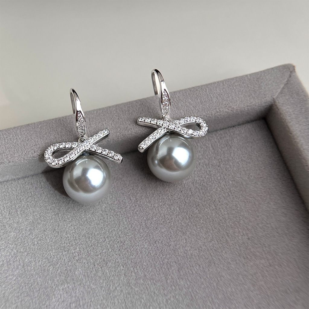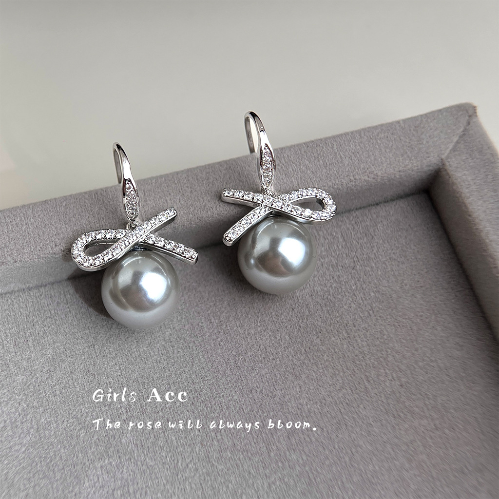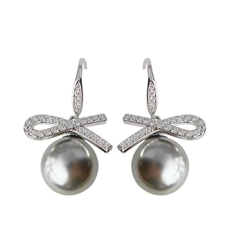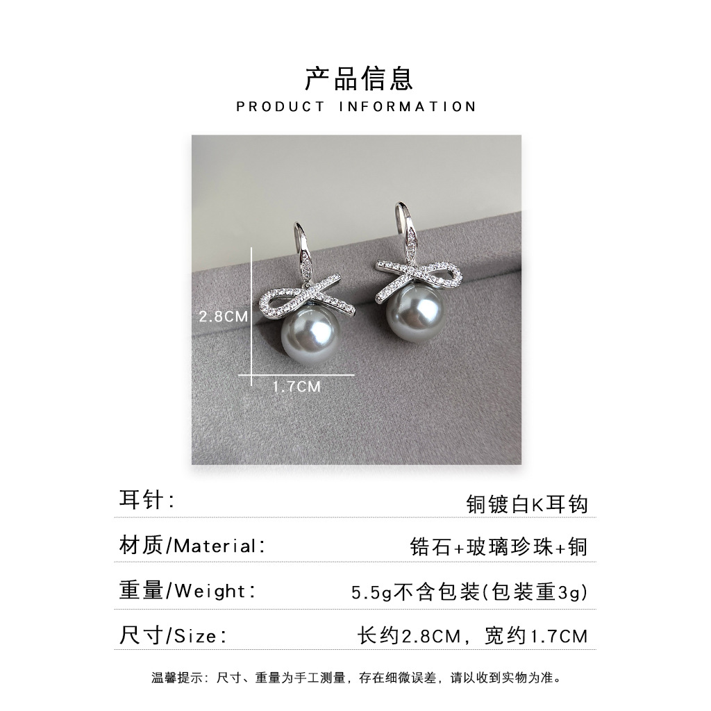 A廠 銅鍍白K|日韓款輕奢鋯石蝴蝶結灰珍珠銀針耳環 批發 折扣@洽客服 26.02.W3「3969」