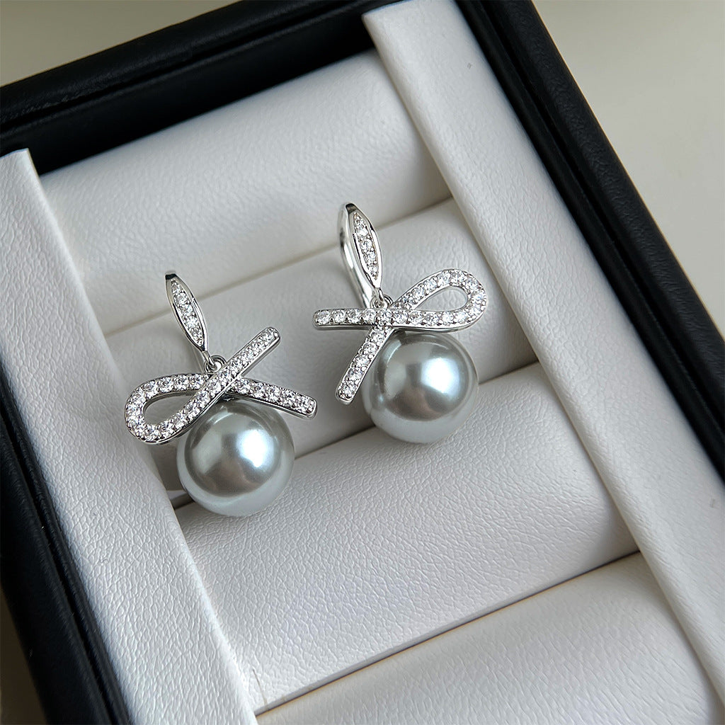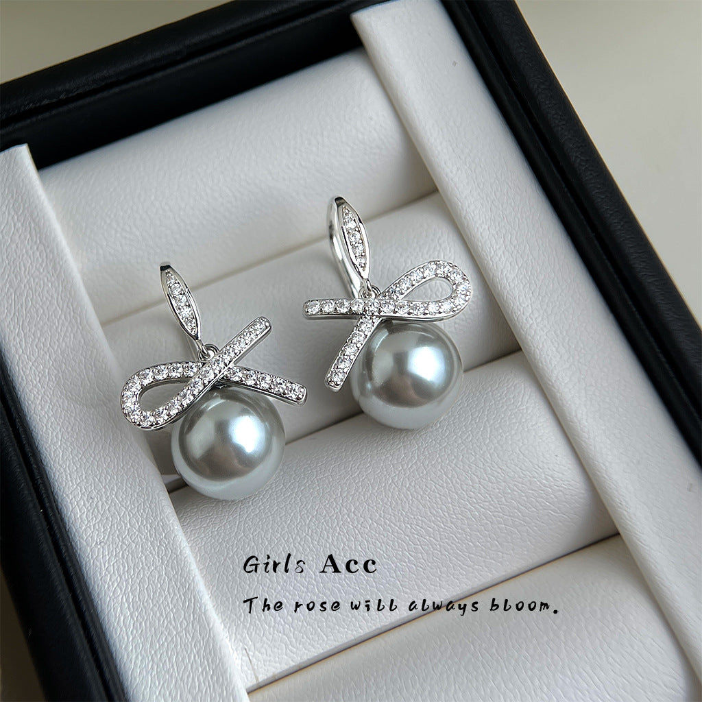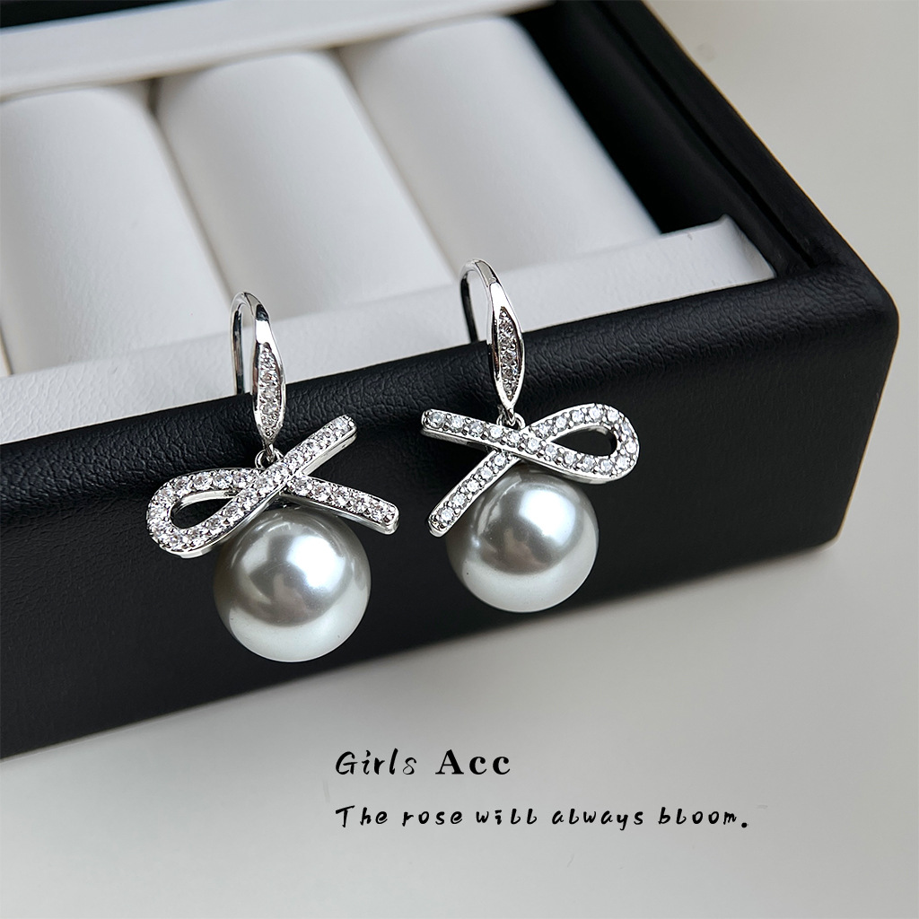 A廠 銅鍍白K|日韓款輕奢鋯石蝴蝶結灰珍珠銀針耳環 批發 折扣@洽客服 26.02.W3「3969」