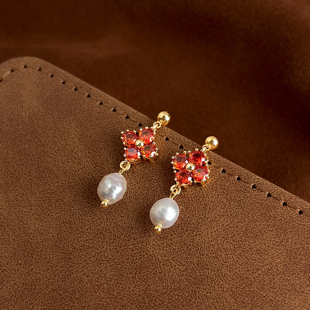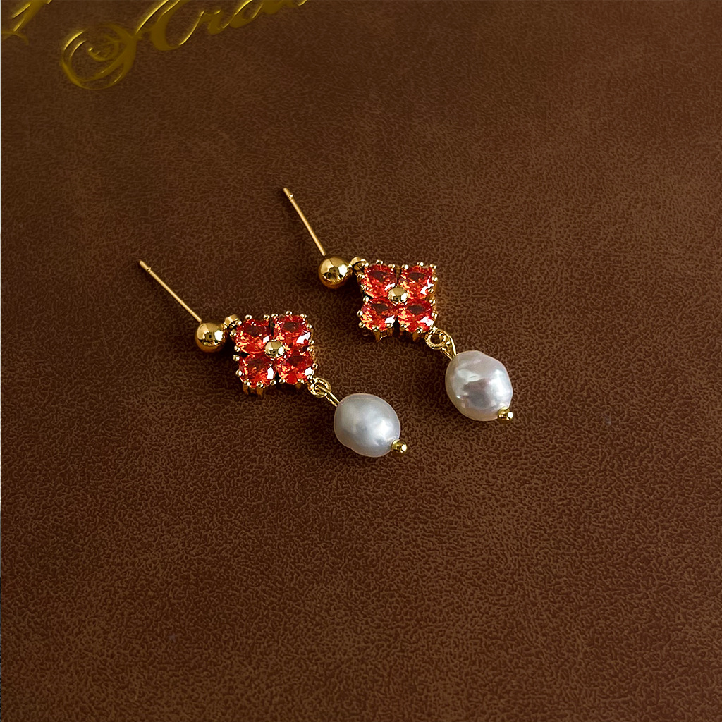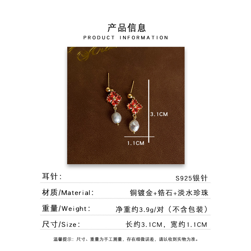 A廠 韓系款輕奢重工紅鋯石淡水珍珠銀針銀針耳環 批發 折扣@洽客服 25.12.W2「6917」