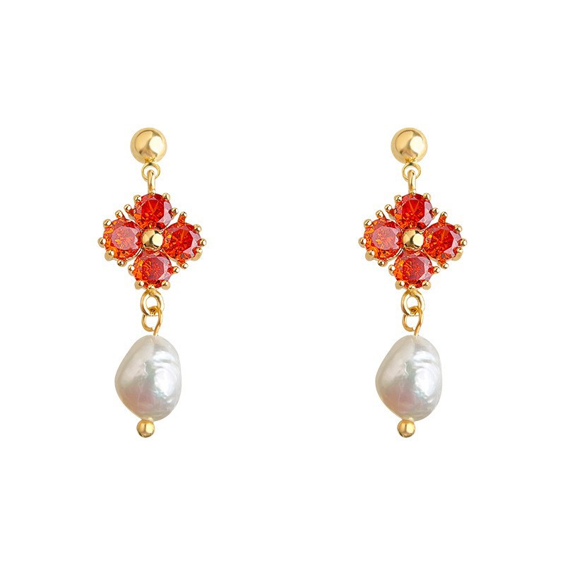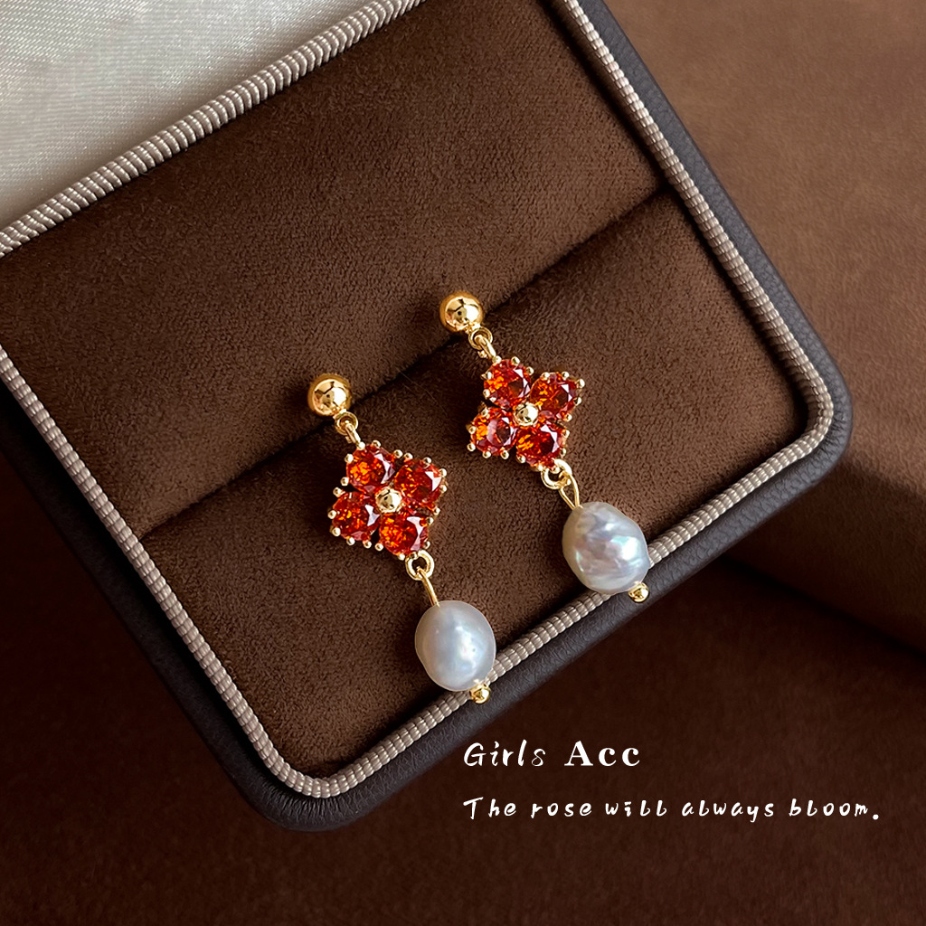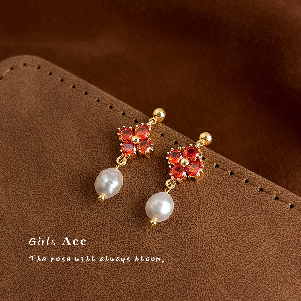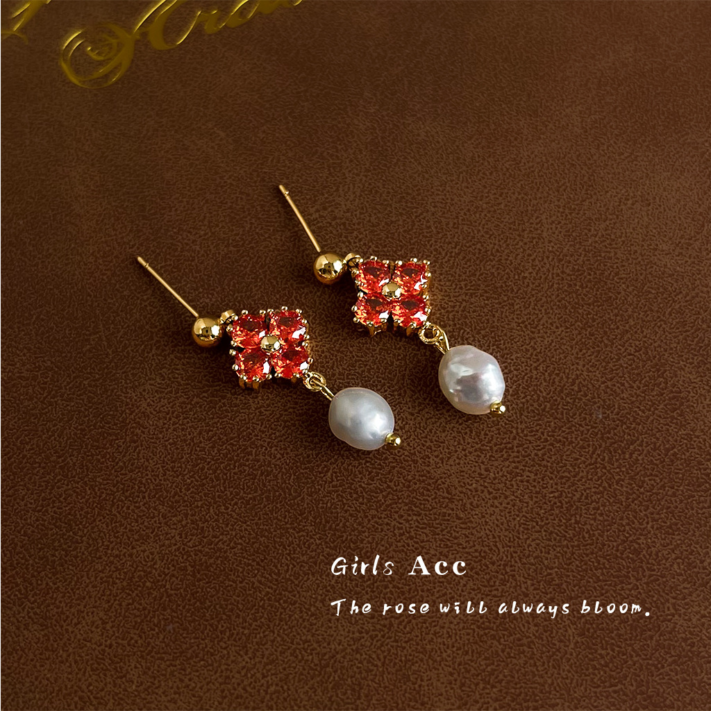 A廠 韓系款輕奢重工紅鋯石淡水珍珠銀針銀針耳環 批發 折扣@洽客服 25.12.W2「6917」