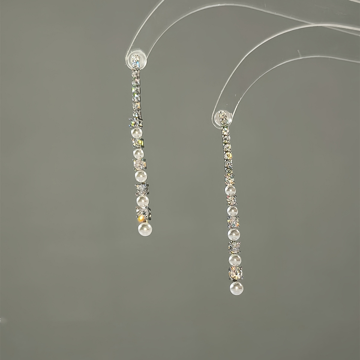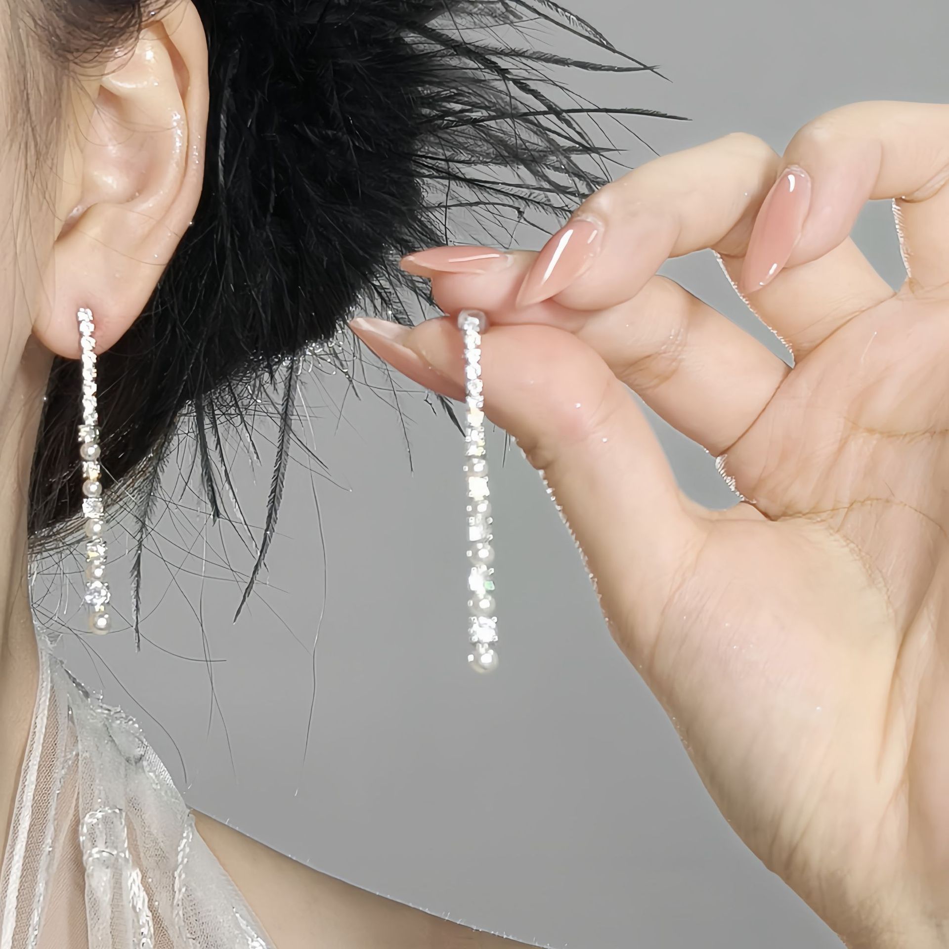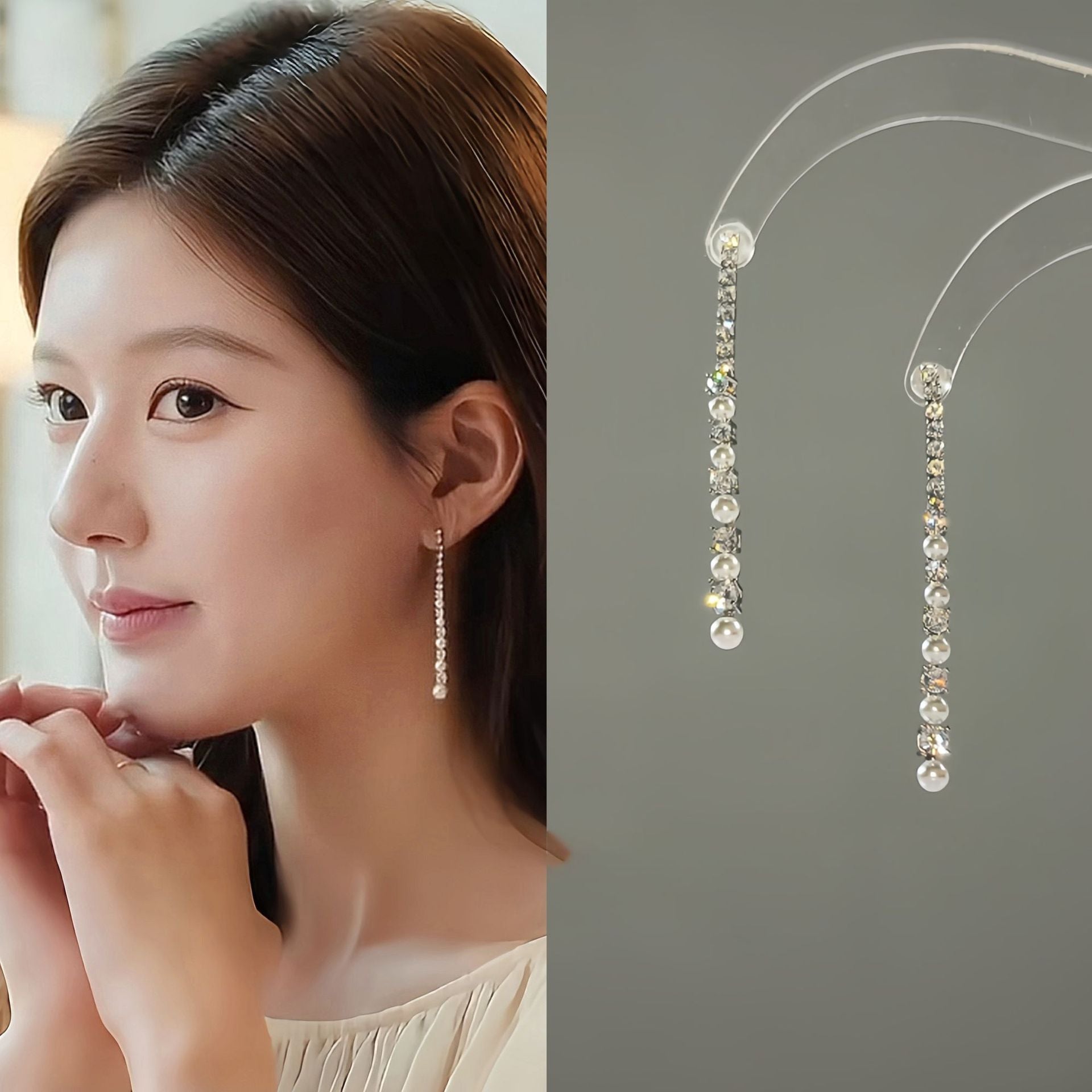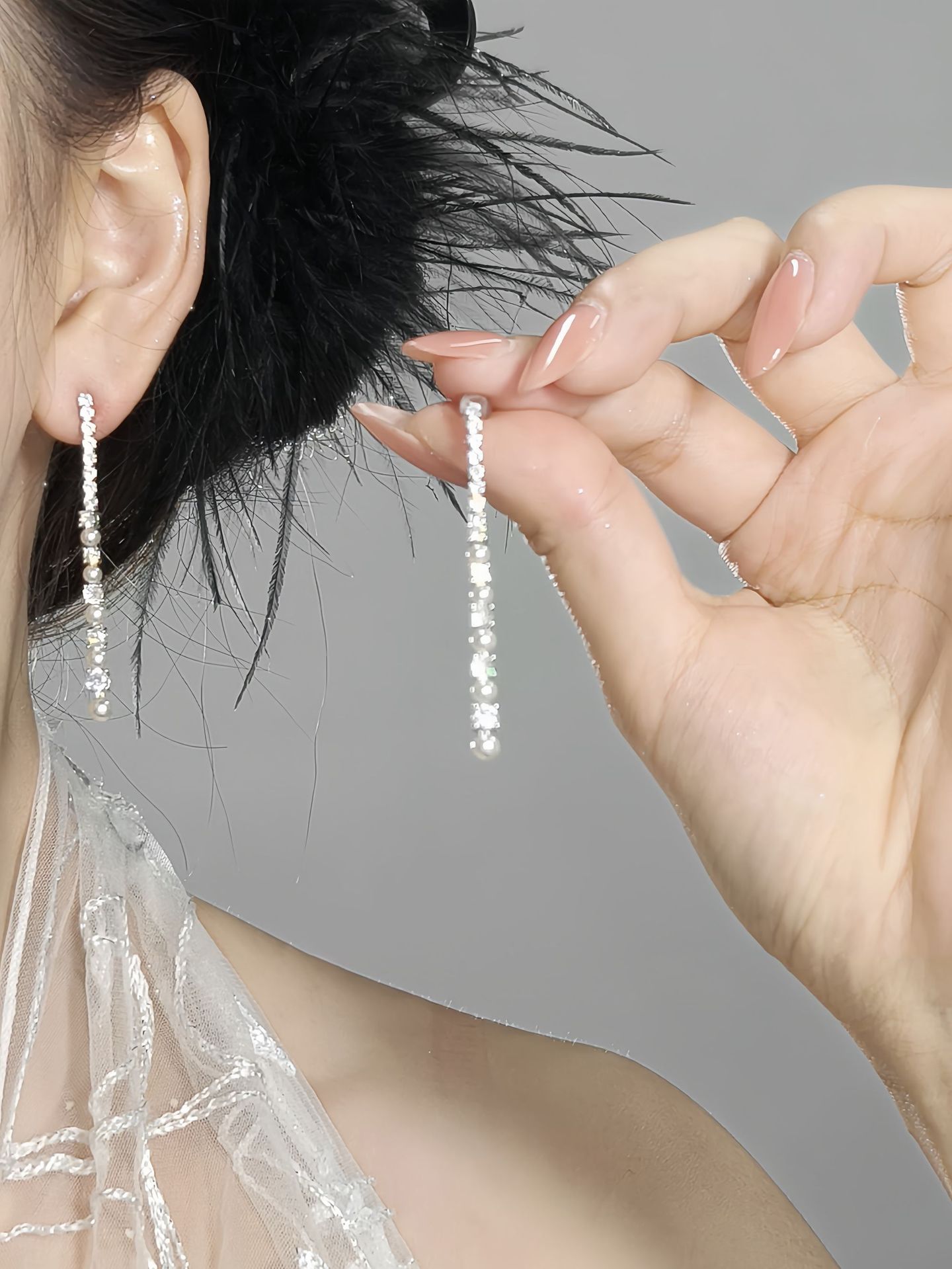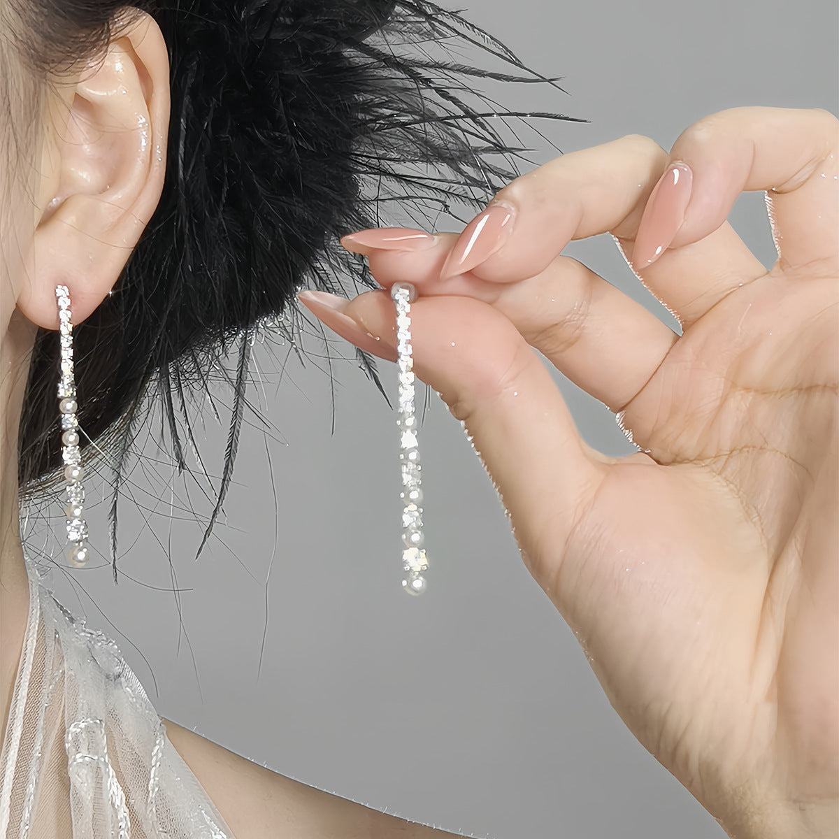 A2廠 韓國韓版超閃鋯石長珍珠流蘇銀針耳環 批發 折扣@洽客服 25.11.W1「HE24410」