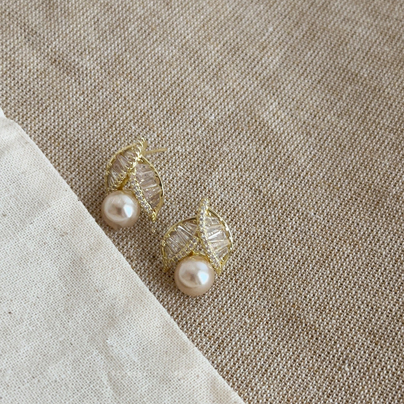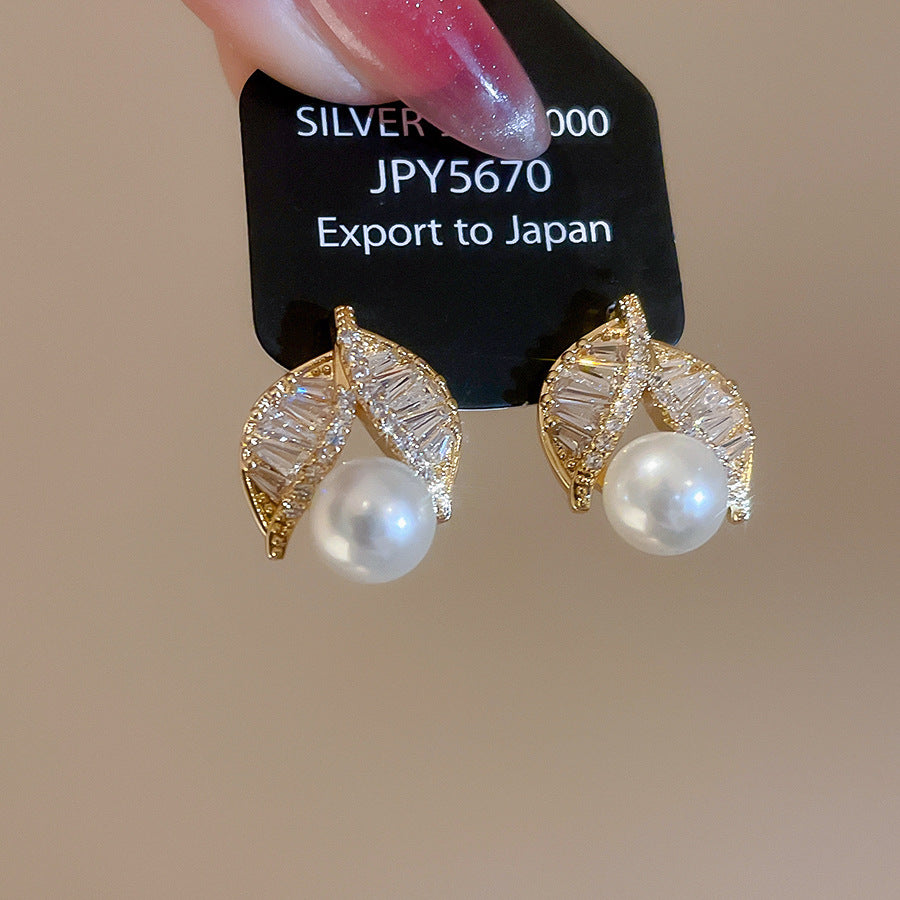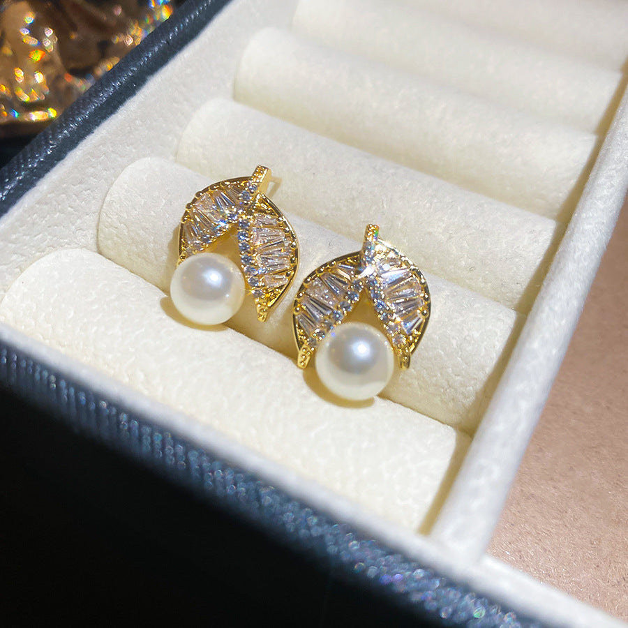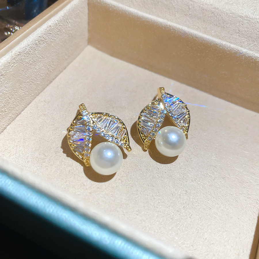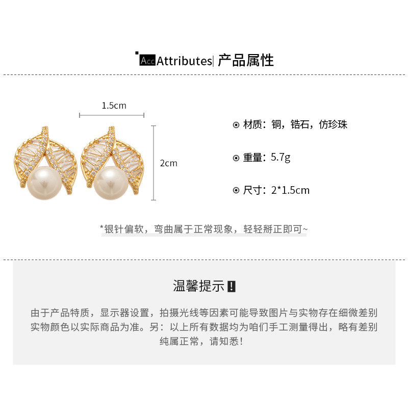 A2廠 韓國韓版鑲鋯石樹葉珍珠鈦鋼電鍍真金耳環 批發 折扣@洽客服 26.01.W1「HE29758」