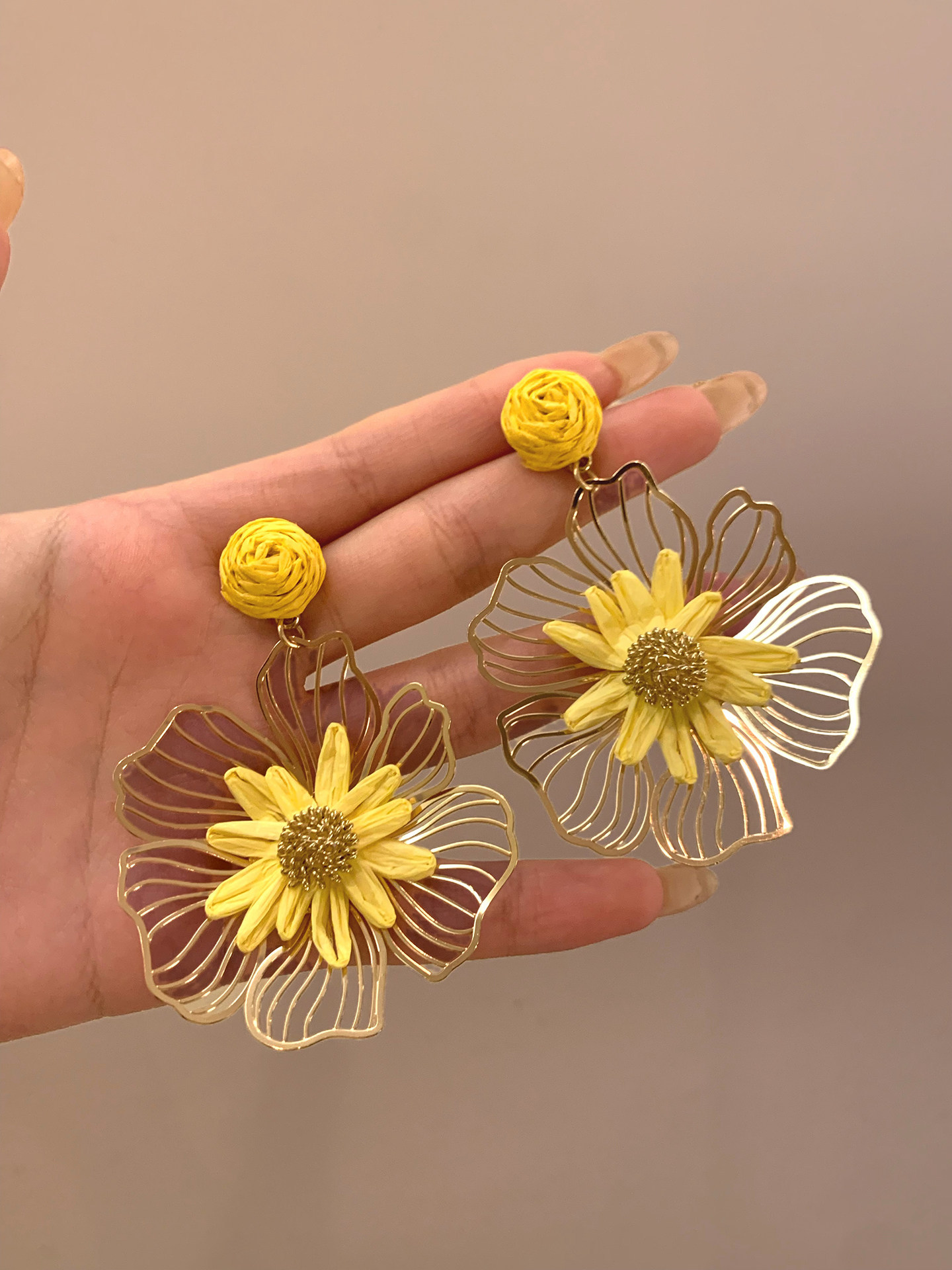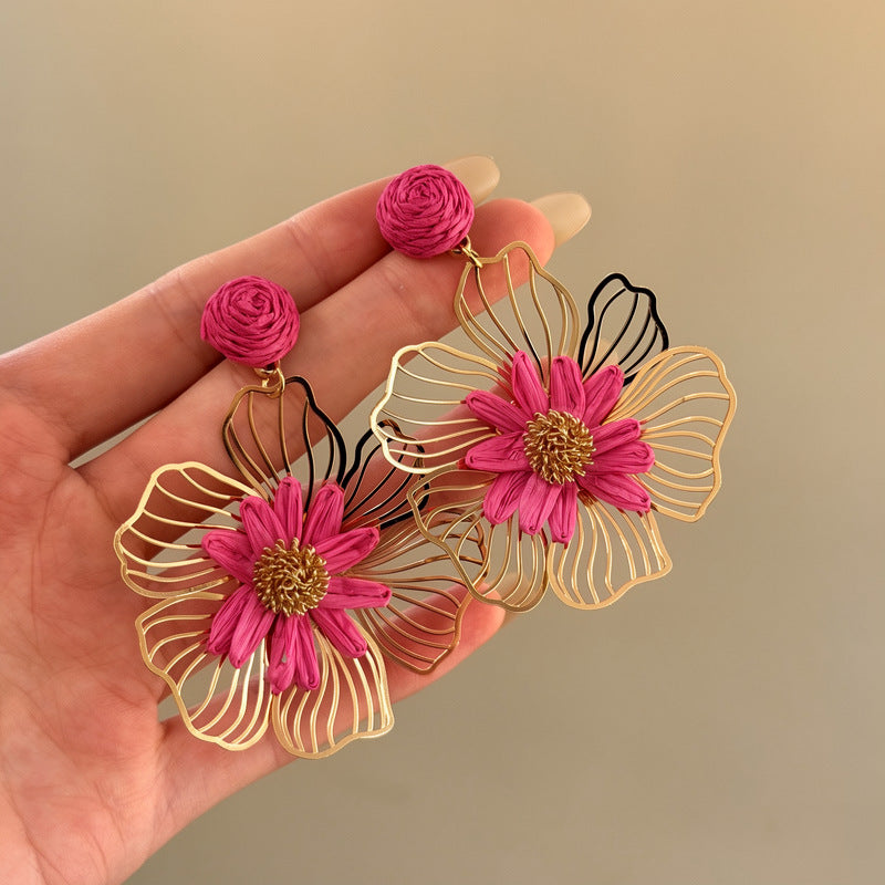 A2廠 韓國韓版金屬拉菲草鏤空花朵銀針耳環批發 折扣@洽客服 26.03.W3「HE30935」