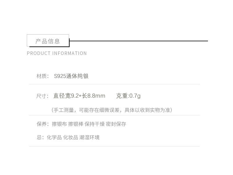 - 因台灣的氣候較為潮濕,若將合金類飾品暴露於空氣中會加速氧化,建議不配戴時將飾品分別收納至夾鏈袋內保存,避免接觸空氣後氧化。