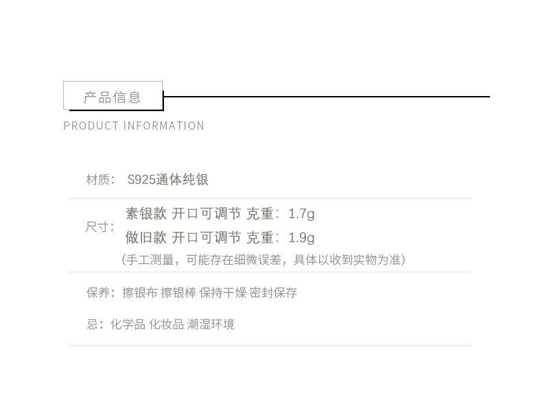 - 因台灣的氣候較為潮濕,若將合金類飾品暴露於空氣中會加速氧化,建議不配戴時將飾品分別收納至夾鏈袋內保存,避免接觸空氣後氧化。