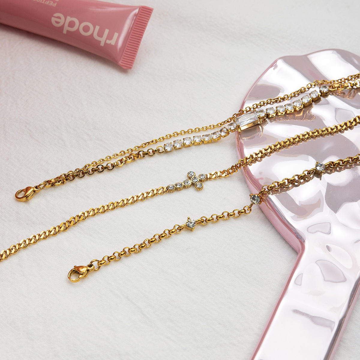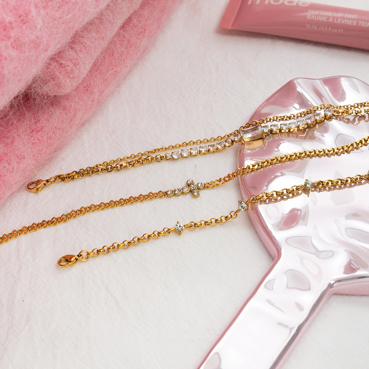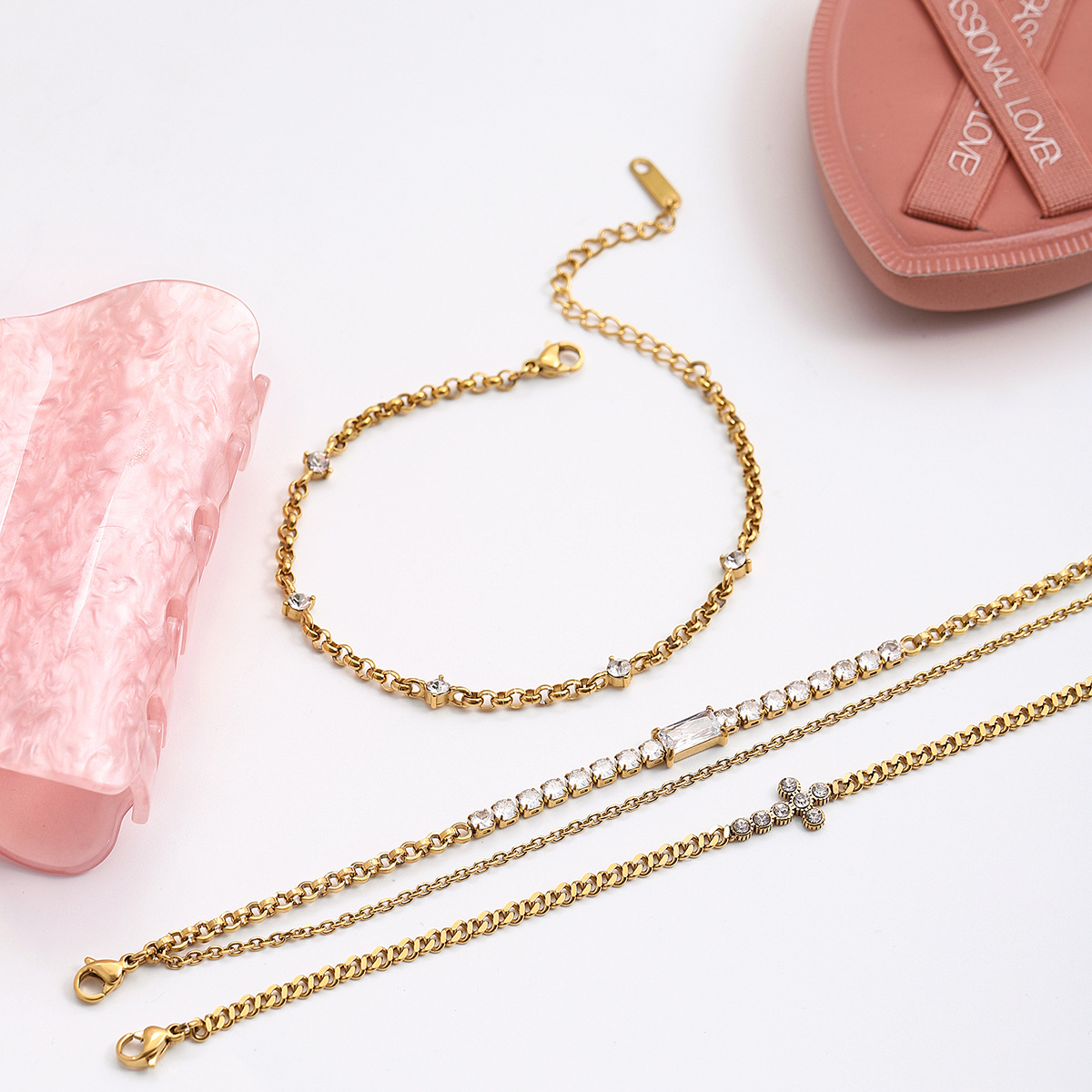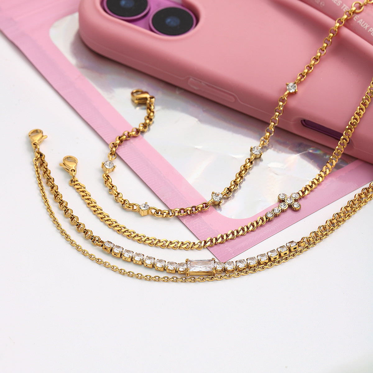 B廠 歐美款 圓形白色鋯石十字鏈 鈦鋼鍍18K金手鍊 批發 折扣@洽客服 25.10.W5「JDB0307032」