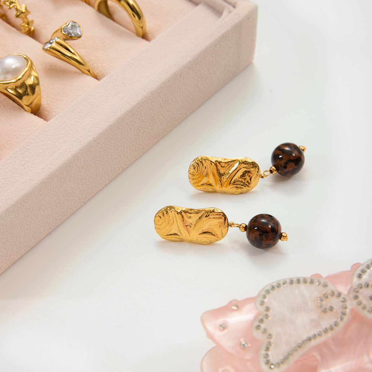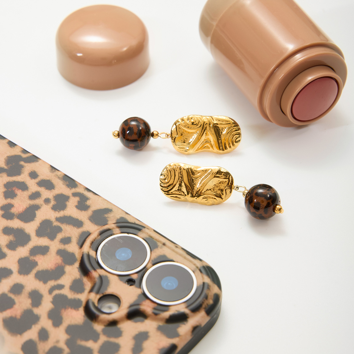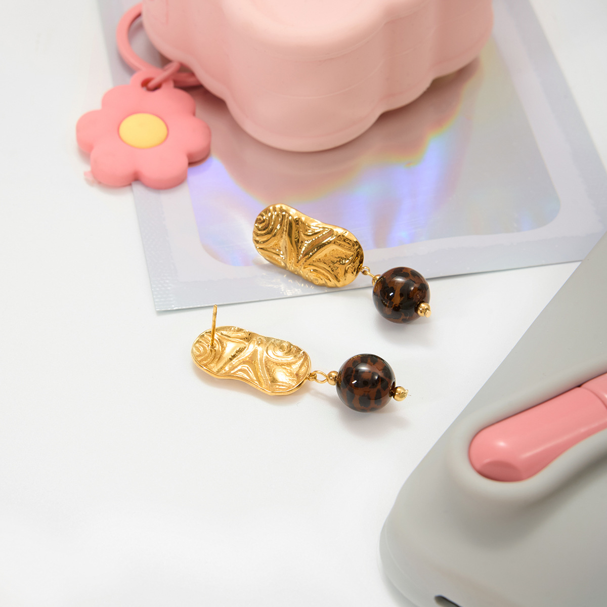 B廠 歐美款 OLIVIA 豹紋樹脂珠子鈦鋼鍍18K金耳環 批發 折扣@洽客服 25.11.W2「JDE0304009-BR」