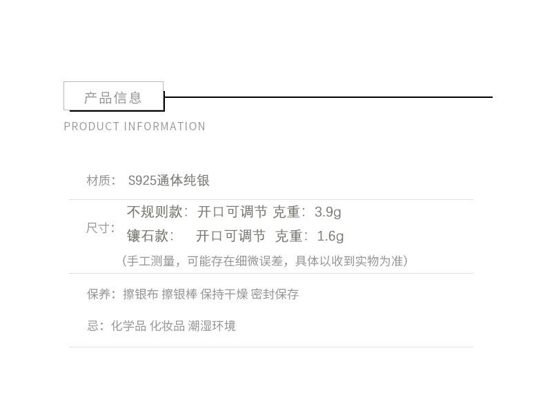 - 因台灣的氣候較為潮濕,若將合金類飾品暴露於空氣中會加速氧化,建議不配戴時將飾品分別收納至夾鏈袋內保存,避免接觸空氣後氧化。