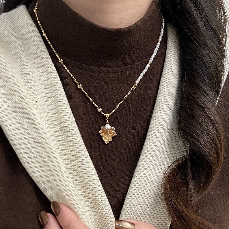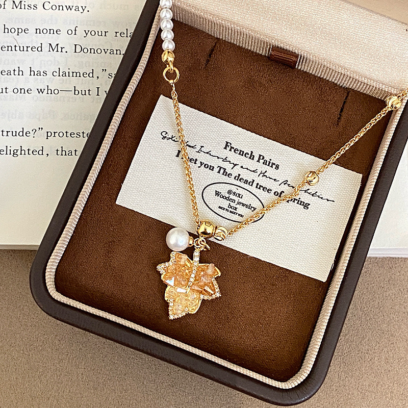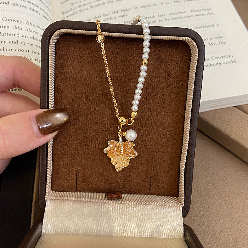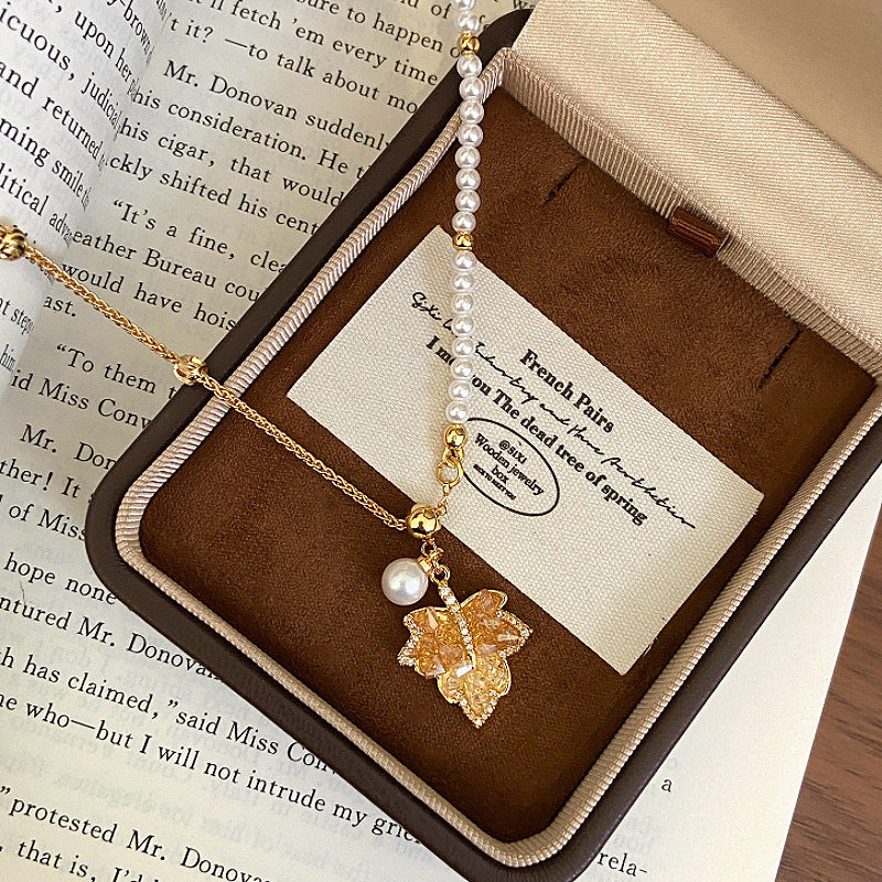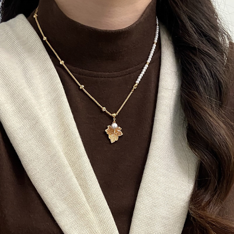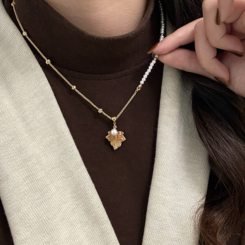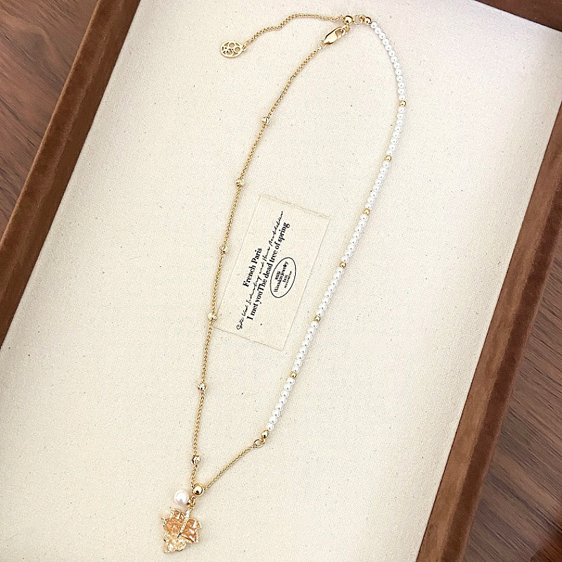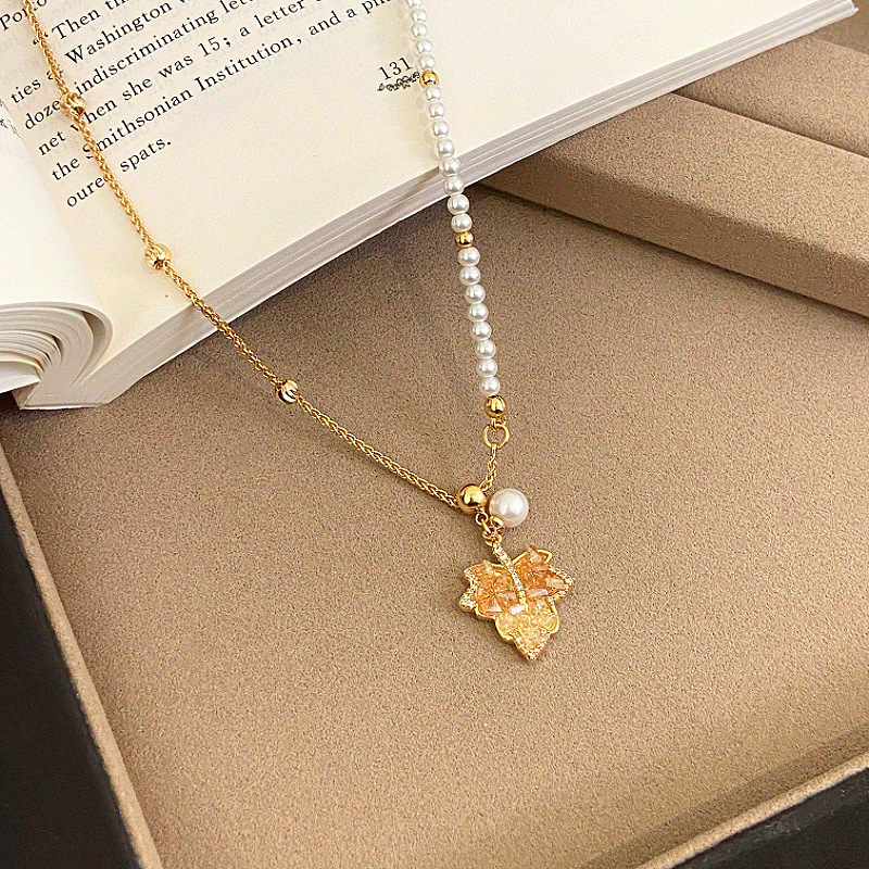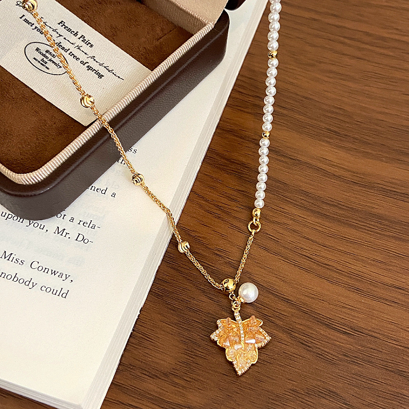 A2廠 韓國韓版鋯石楓葉珍珠串珠電鍍18K真金項鍊 批發 折扣@洽客服 25.11.W2「WN1854」