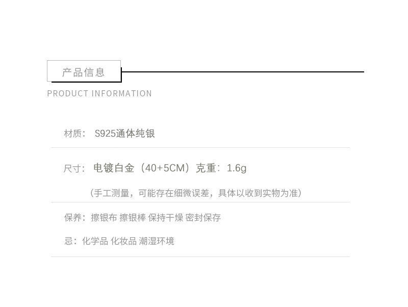 - 因台灣的氣候較為潮濕,若將合金類飾品暴露於空氣中會加速氧化,建議不配戴時將飾品分別收納至夾鏈袋內保存,避免接觸空氣後氧化。