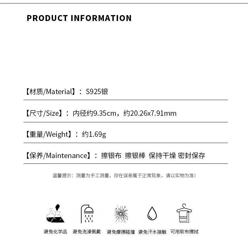 - 因台灣的氣候較為潮濕,若將合金類飾品暴露於空氣中會加速氧化,建議不配戴時將飾品分別收納至夾鏈袋內保存,避免接觸空氣後氧化。